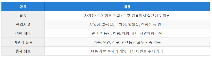 - 특징: 맑고 투명한 바닷물과 함께 편의시설이 우수하여 휴양과 해양 레저 활동을 함께 즐기기에 최적의 장소입니다.